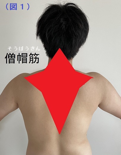肩こりの原因となる筋肉は主に首の後ろから肩や背中にかけて幅広く覆っている僧帽筋(図1)の