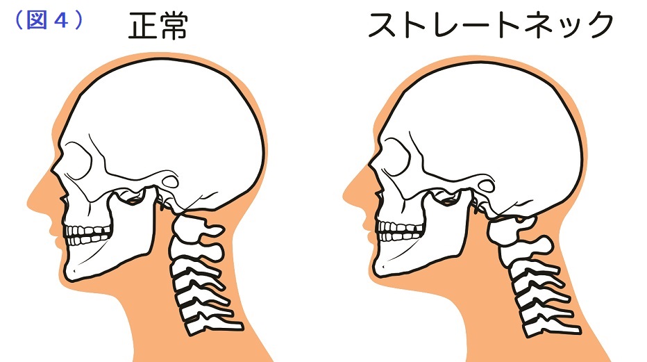 図4の左側のイラストのように、正常な首の骨は緩やかな曲線を描いています。これは重い頭部を支え、また、衝撃を吸収するためです。しかし、スマホやパソコンの使い過ぎなどにより首の骨のカーブがなくなり、まっすぐになってしまう場合があります。これをストレートネックといい、カーブがなくなることで頭部を筋肉だけで支えることから大きな負荷がかかり慢性的な肩こりや頭痛などの症状が引き起こされます。